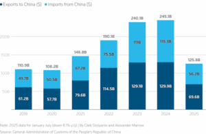Гэсэн хэдий ч 2025 оны 1-р сараас 7-р сар хүртэл худалдааны эргэлт өмнөх оны мөн үетэй харьцуулахад 8.1%-иар буурсан нь Орос руу автомашины импорт буурч, Хятад руу нефтийн экспорт буурсантай холбоотой аж.