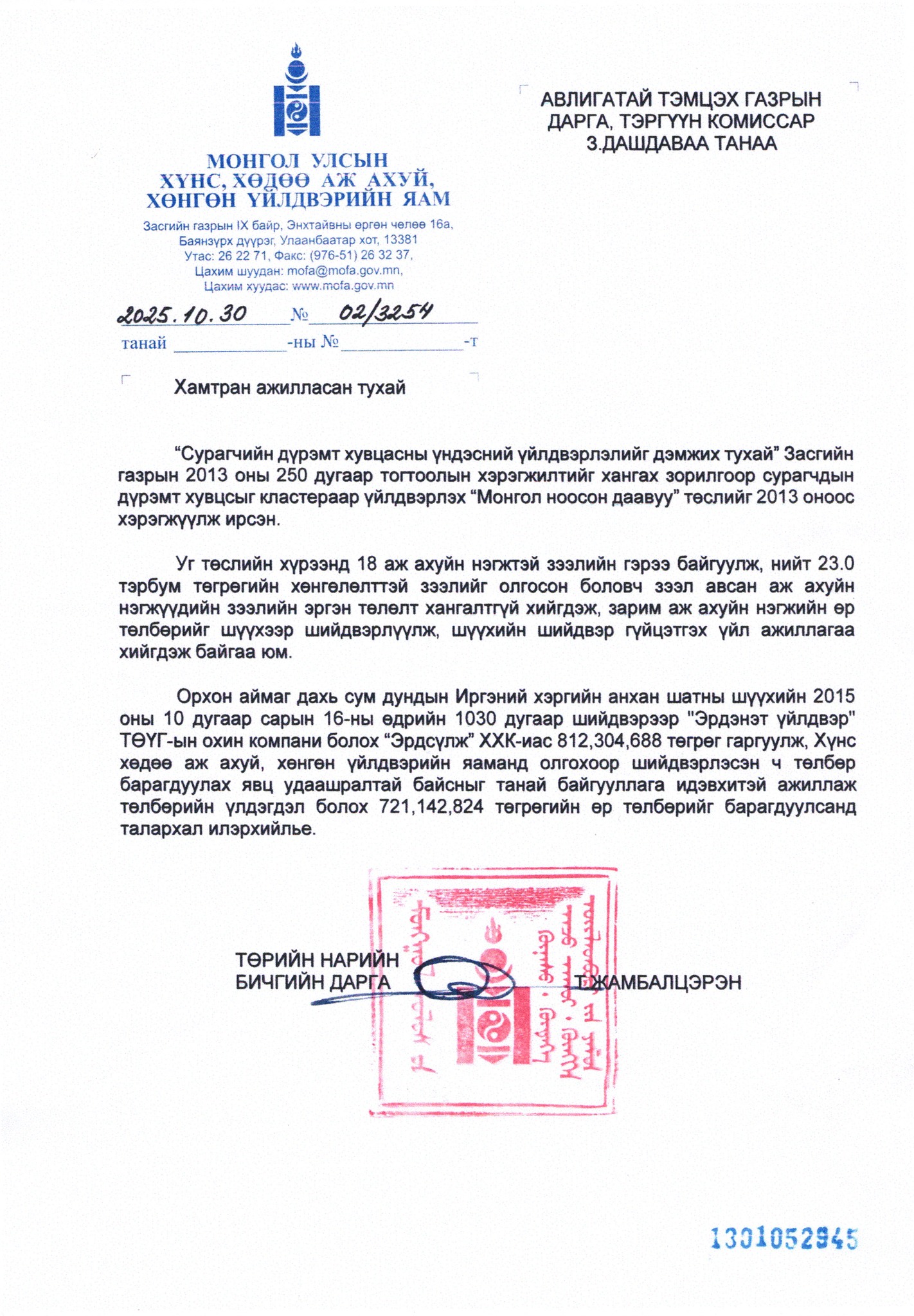 Хүнс, хөдөө аж ахуй, хөнгөн үйлдвэрийн яамны Төрийн нарийн бичгийн дарга Т.Жамбалцэрэнгээс ирүүлсэн албан бичигт “Эрдсүлж” ХХК-иас 812,3 сая төгрөгийг гаргуулах шүүхийн шийдвэр 2015 онд гарсан ч Авлигатай тэмцэх газар идэвхтэй ажилласнаар 721,1 сая төгрөгийн өр төлбөрийг барагдуулсан талаар дурдаж, талархал илэрхийлэв.