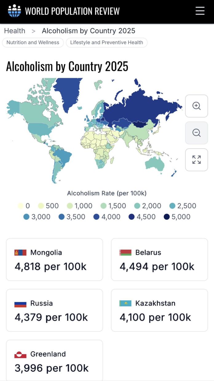 World Population Review сайтын мэдээллээр 2025 онд нийт хүн амд ногдох архинд донтох эмгэгийн (Alcohol Use Disorder) тархалтын түвшнээр Монгол Улс дэлхийд хамгийн өндөр хувьтай (48.18%) гэж гарчээ. Энэ нь зөвхөн “архины хэрэглээ их” гэсэн утга биш, харин эмнэлзүйн оношлогооны шалгууруудыг (DSM-5) хангаж буй хүмүүст үндэслэсэн статистик юм. Өөрөөр хэлбэл, өвчин болсон буюу сэтгэцийн асуудалтай ард түмэн болсны илэрхийлэл.