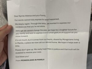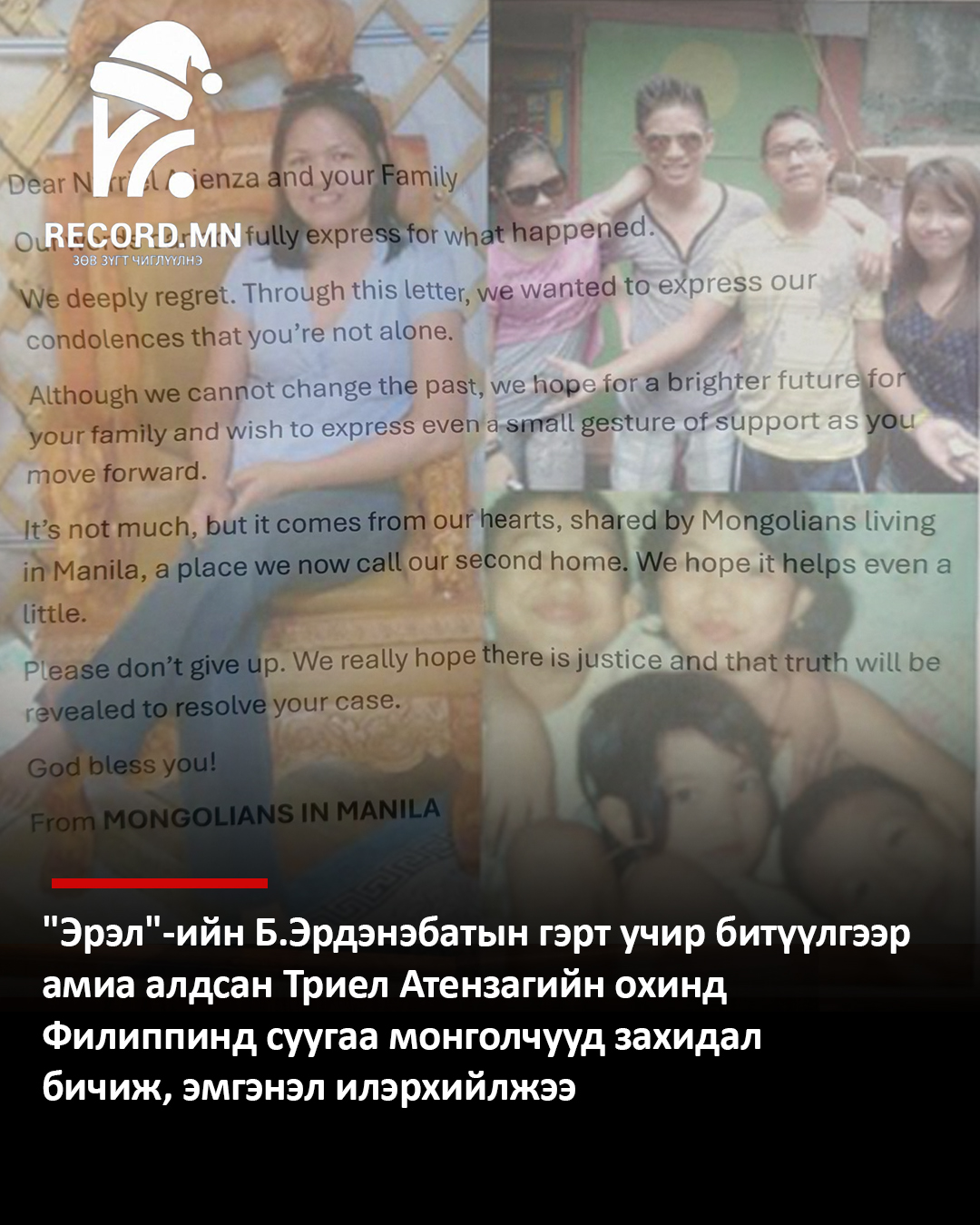 “Эрэл”-ийн Б.Эрдэнэбатын гэрт учир битүүлгээр амиа алдсан Триел Атензагийн охинд Филиппинд суугаа монголчууд захидал бичиж, эмгэнэл илэрхийлжээ.