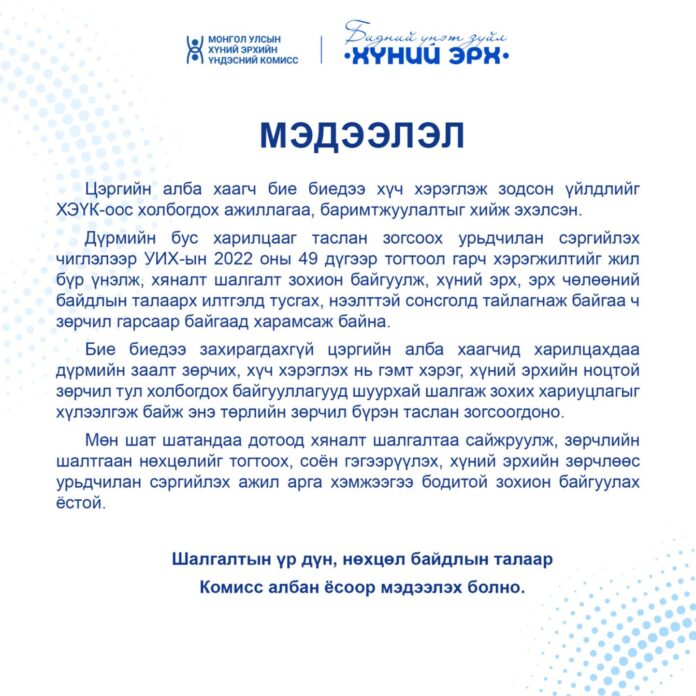 Дүрмийн бус харилцааг таслан зогсоох урьдчилан сэргийлэх чиглэлээр УИХ-ын 2022 оны 49 дүгээр тогтоол гарч хэрэгжилтийг жил бүр үнэлж, хяналт шалгалт зохион байгуулж, хүний эрх, эрх чөлөөний байдлын талаарх илтгэлд тусгах, нээлттэй сонсголд тайлагнаж байгаа ч зөрчил гарсаар байгаад харамсаж байна.