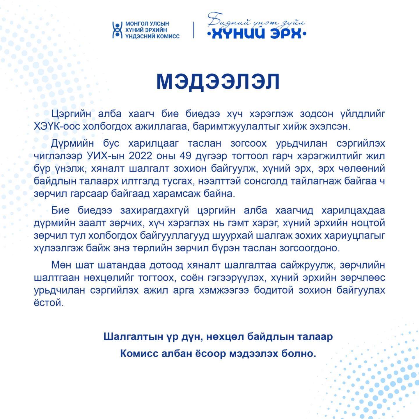 Шалгалтын үр дүн, нөхцөл байдлын талаар Комисс албан ёсоор мэдээлэх болно.