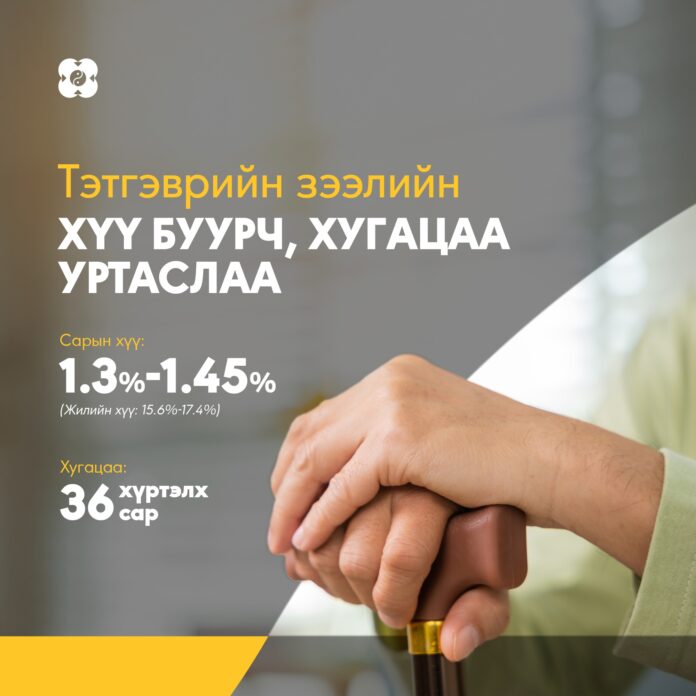 Он гарсаар ахмадууд тэтгэврээ 36 сар хүртэл хугацаатайгаар сарын тэтгэврийн дүнгийн 70%-д нь зээл авах боломжтой болжээ. Өөрөөр хэлбэл, харилцагчийн гарт үлдэх мөнгөний хэмжээ нийт сарын тэтгэврийн дүнгийн 30%-аас багагүй байх юм.