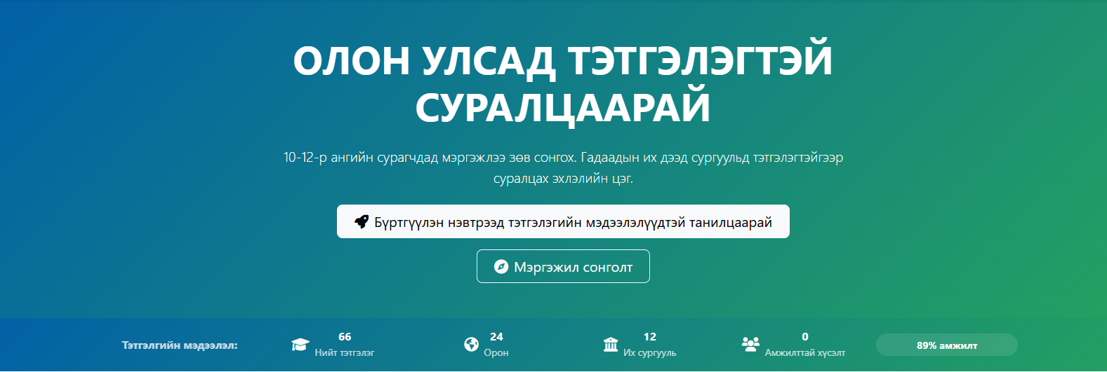 Ерөнхий боловсролын 10-12 дугаар ангийн сурагчдад зориулсан цогц боловсролын платформ болох Surya.mn өнөөдөр албан ёсоор нээлтээ хийлээ. Энэхүү платформ нь залуучуудад мэргэжлээ зөв сонгох, хэлний түвшнээ тодорхойлох, дэлхийн шилдэг их сургуулиудын мэдээлэлтэй танилцах, олон улсын тэтгэлгийн боломжуудыг нэг дороос хайж олох боломжийг олгож байна.