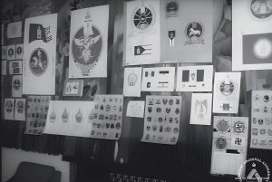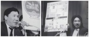 АИХ-ын II чуулганы хуралдаанд зураач Ш.Тэнгисболд, Ц.Ойдов нар Төрийн сүлд, туг, далбаа,тамгын загвар. 1991 он