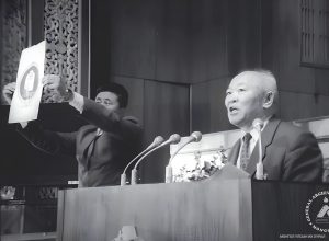 АИХ-ын чуулганы хуралдаанд Ардын зураач Н.Чүлтэм өөрийн бүтээсэн Төрийн сүлдийн загварыг танилцуулж байна. 1991 он