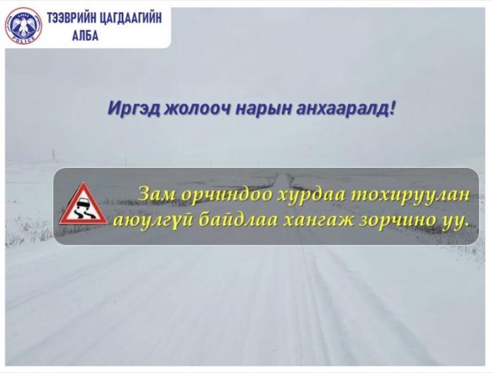 Үүнээс үүдэн зам, даваа гүвээнд халтиргаа гулгаа ихэсч, үзэгдэх орчин хязгаарлагдах тул Улсын болон орон нутгийн чанартай хатуу хучилттай авто замаар зорчихдоо анхаарал болгоомжтой зорчих мөн автомашины бүрэн бүтэн байдлыг шалгах, цаг агаарын урьдчилсан мэдээг сонсож холын замд зорчихыг цагдаагийн байгууллагаас анхааруулж байна!