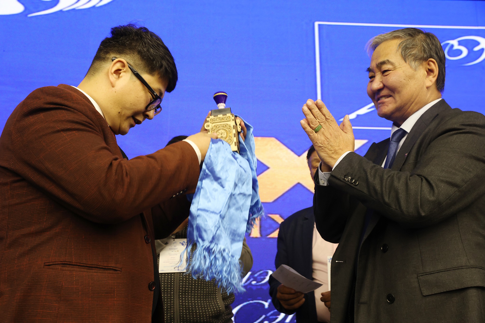 Ингээд МЗЭ-ийн дүрэмд зааснаар Их чуулганы хуралдаанд оролцогчдын олонхийн саналыг авч, Удирдах зөвлөлийн даргаар сонгогдсон Д.Нямдоржид Монгол Улсын Гавьяат багш, утга зохиол судлаач Ч.Жачин МЗЭ-ийн тамгыг гардуулж, баяр хүргэлээ.