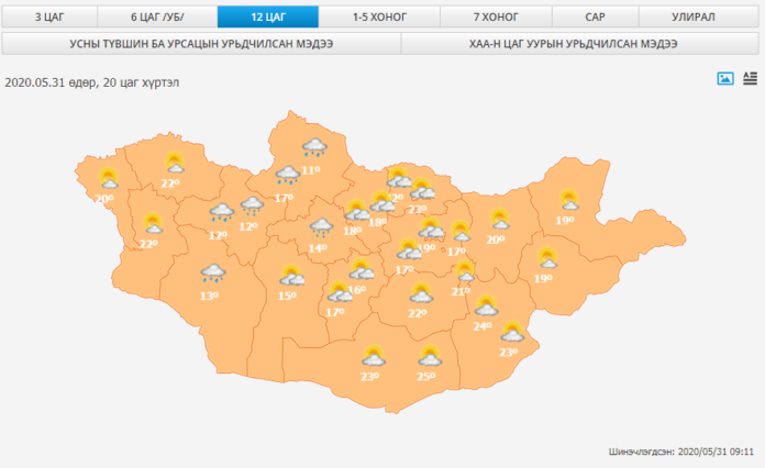 Ихэнх нутгаар үүлшинэ. Баруун болон төвийн аймгуудын нутгийн хойд хэсэг, говийн аймгуудын нутгийн ззарим газраар бага зэргийн бороо орно. Салхи говийн аймгуудын нутгаар баруун хойноос, бусад нутгаар баруун өмнөөс секундэд 6-11 метр, зарим газраар секундэд 15-17 метр хүрч ширүүсч шороон шуурга шуурна. Хангай, Хөвсгөлийн уулархаг нутаг, Завхан голын эх, Хүрэнбэлчир орчмоор 16-21 градус, Их нууруудын хотгор болон Алтайн өвөр говиор 24-29 градус, бусад нутгаар 19-24 градус дулаан байна.