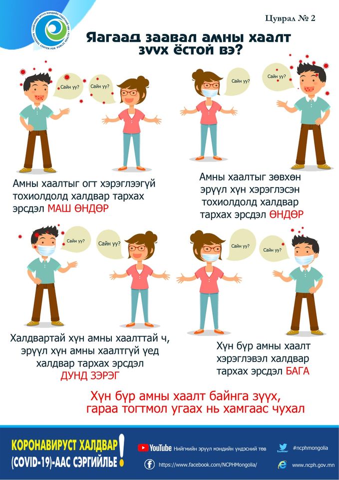 Яагаад амны хаалт зүүх ёстой вэ? 28/08/2020 1501 Facebook Twitter Google+ Нийгмийн эрүүл мэндийн үндэсний хүрээлэнгээс Ковид-19 цар тахлын үеийн сэрэмжлүүлэг, мэдээллийг цуварлаас өгсөөр байна. Энэ удаад яагаад амны хаалт зүүх ёстойг хүргэж байна.
