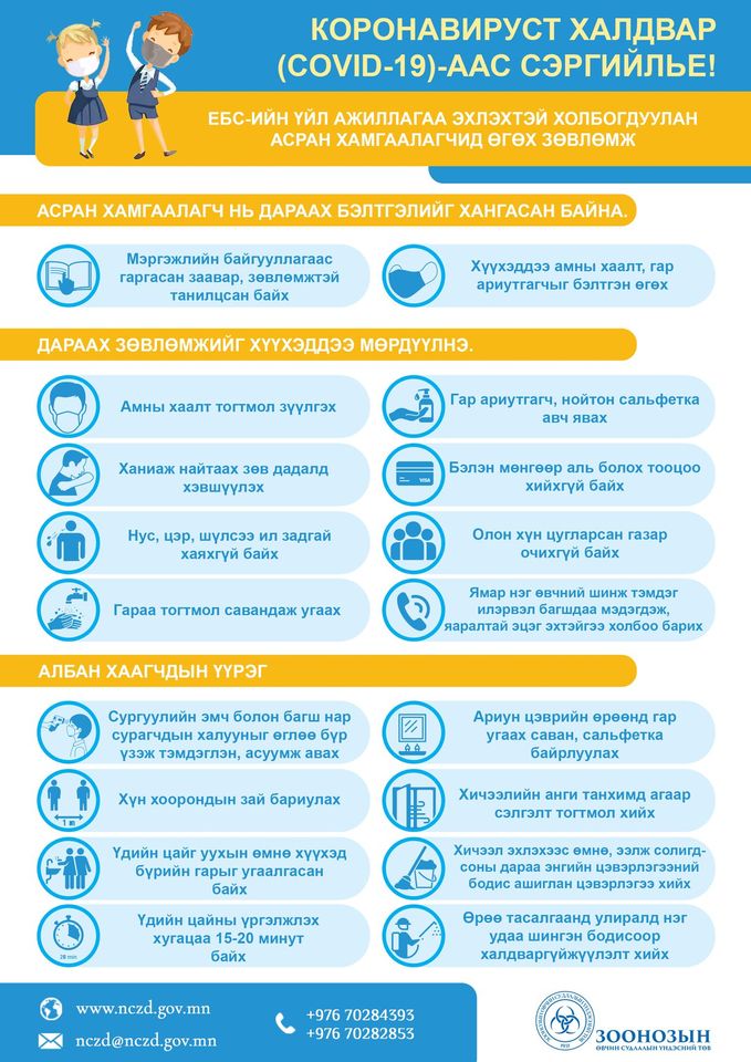 ЕБС-ийн үйл ажиллагаа эхлэхтэй зэрэгцэн асран хамгаалагчид өгөх зөвлөгөө 30/08/2020 531 Facebook Twitter Google+ Сургуулийн үйл ажиллагаа эхлэхтэй холбогдуулан асран хамгаалагч болон албан хаагчдад Мэргэжлийн хяналтын ерөнхий газар, Эрүүл мэндийн яам, НЭМҮТ зэрэг холбогдох байгууллагуудаас зөвлөмж гаргажээ.