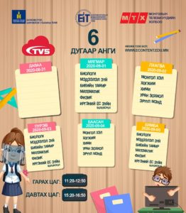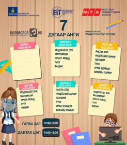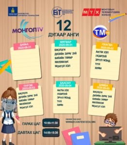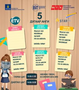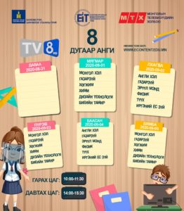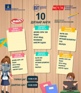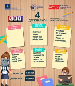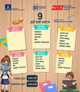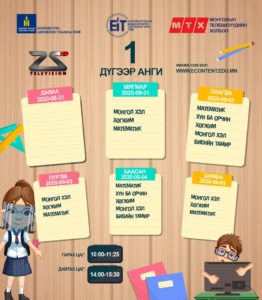 Засгийн газраас гаргасаншийдвэрийн дагуу хүүхдүүд долоо хоногийн гурван өдөр танхимаар, хоёр өдөр цахимаар хичээллэх ёсой. Энэ дагуу цахим хичээлийн цагийн хуваарь гарчээ. [Tweet “Есдүгээр сарын цахим хичээлээр өмнө үзсэн хичээлийг бататган сануулах, ойлгоогүй бол нөхөж ойлгуулахад анхаарах ажээ.”]