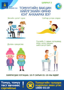 [Tweet “Иргэн та томуугийн вакцин хийлгэхийн өмнө сайтар унтаж, дулаан хувцаслахаас гадна ямар нэгэн өөр вакцин хийлгээгүй байхыг анхааруулж байна.”]Иргэн та амны хаалтаа зөв зүүж, гараа тогтмол угааж, хүн хоорондын зайг баримтлан хувь хүнээс шалтгаалах арга хэмжээг сайтар хэрэгжүүлж, эрүүл мэндийнхээ төлөө хариуцлагатай байгаарай.