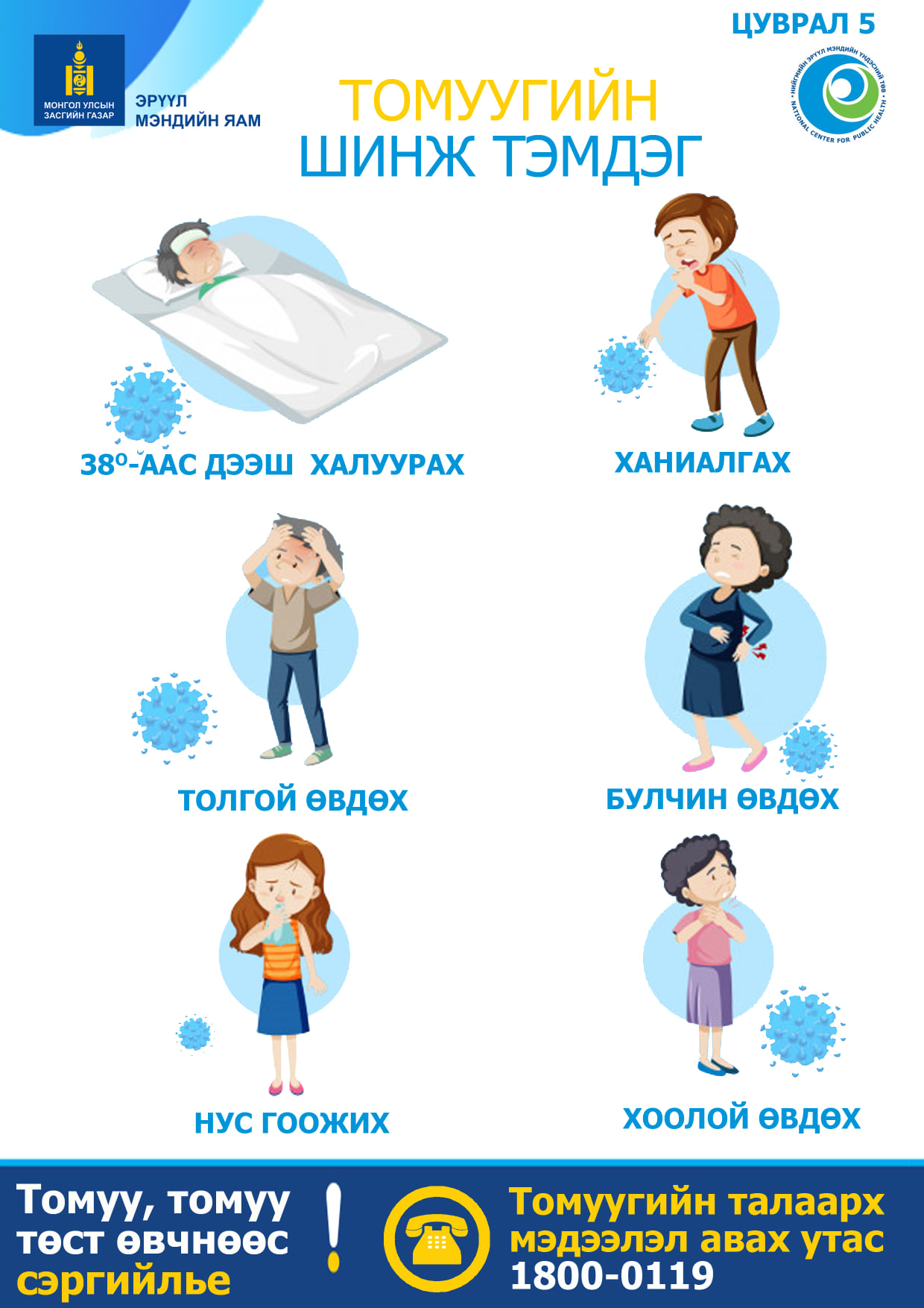 Та 38 хэмээс дээш халуурч, толгой өвдөн, ханиалгаж, хоолой өвдөж, булчин өвдөж, мөн нус гоожиж байвал эмчид хандаарай. Та томуу туссан байх магадлалтай юм.