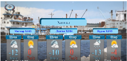 Нутгийн хойд хэсгээр үүлшинэ, бусад нутгаар багавтар үүлтэй.[Tweet “Баруун аймгуудын нутгийн баруун хэсгээр ялимгүй цас орно.”] Бусад нутгаар цас орохгүй. Салхи зүүн аймгуудын нутгаар баруун хойноос, бусад нутгаар баруунаас секундэд 5-10 метр, зүүн аймгуудын нутгийн зарим газраар секундэд 12-14 метр хүрч ширүүснэ. Хангай, Хөвсгөл, Хэнтэйн уулархаг нутаг, Завхан голын эх, Идэр, Тэс, Тэрэлж, Халх голын хөндийгөөр 0-5 градус хүйтэн, Их нууруудын хотгор, Хангайн нурууны өвөр бэл болон говийн бүс нутаар 6-11 градус, бусад нутгаар 1-6 градус дулаан байна.