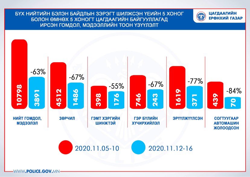 Гэр бүлийн хүчирхийлэл 67 хувиар буурчээ 17/11/2020 540 Facebook Twitter Google+ Бүх нийтийн бэлэн байдлын зэрэгт шилжсэн 5 хоногийн эрүү, хэв журмын нөхцөл байдлыг өмнөх долоо хоногийн 5 хоногтой харьцуулсан судалгааг гаргажээ.