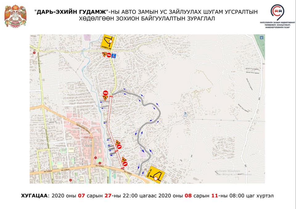 [Tweet “Их тойруу, Дарь-Эхийн уулзвараас “Сод Монгол” ШТС хүртэл Дарь-Эхийн гудамжны 3,3км авто замын шинэчлэлтийн ажил хийгдэж байна.”]Энэ хүрээнд нэгдүгээр ээлжинд Дарь-Эхийн уулзвараас Хуучин эцсийн автобусны буудал хүртэлх авто замыг 2020 оны 07 дугаар сарын 27-ны 22:00 цагаас 08 дугаар сарын 10-ны 08:00 цаг хүртэл бүрэн хааж ус зайлуулах шугам, хоолойн шинэчлэлтийн ажил хийгдэж байна.