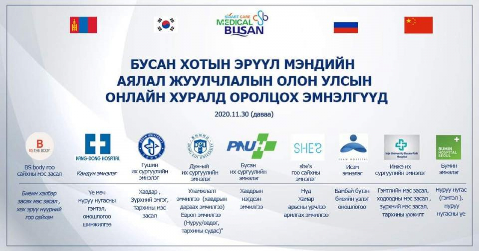 БНСУ-ын Бусан хотын эрүүл мэндийн аялал жуулчлалын цахим уулзалтыг энэ сарын 30-нд манай улсад зохион байгуулах гэж байна. Уг уулзалтад БНСУ-ын 10 орчим эмнэлэг оролцож өөр өөрсдийн үйл ажиллагаа танилцуулж, монголчуудтай хамтран ажиллах боломж, нөхцөлийн талаар ярилцах юм.